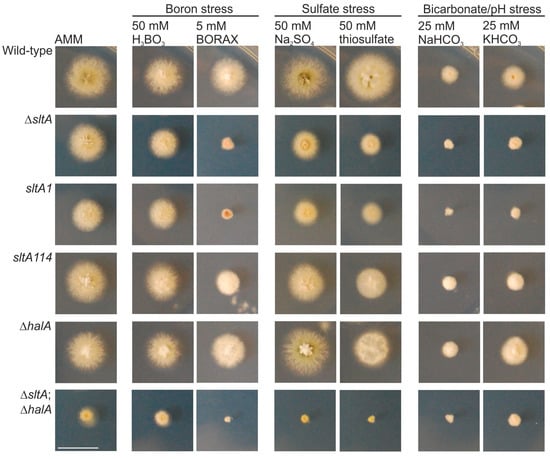 Sensitivity of loss-of-function sltA mutants to stress. Phenotype of wild-type, ΔsltA, sltA1, sltA114, ΔhalA and ΔsltA; ΔhalA strains after 48 h of cultivation at 37 °C in AMM (Aspergillus minimal medium) and AMM with 50 mM boric acid, 5 mM Borax, 50 mM sodium sulfate, 50 mM thiosulfate, or 25 mM of sodium or potassium bicarbonate. Scale bar = 2 cm.