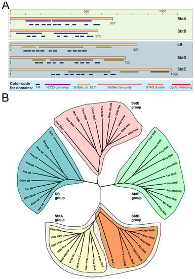Coding sequences of sbtA, sbtB, sB, sbtD and sbtE were confirmed using our RNA-seq results [17,18], but the presence of an additional intron within the third exon of sbtB was observed (see Materials and Methods; see also Figure S1), making us remove 21 amino acids (253–273) from the SbtB sequence used in the BLAST and evolutionary analyses. Orthologs of all A. nidulans SLC-family proteins were identified in filamentous fungal classes, as for example, Eurotiomycetes and Sordariomycetes; also in Saccharomycetes such as S. cerevisiae and higher eukaryotes such as Homo sapiens or Arabidopsis thaliana (with the exception of SbtE, which apparently has no ortholog in H. sapiens) (Table S3). As occurred with Bor1p, the presence of a common ortholog of SbtA and SbtB was predicted in filamentous fungal species such as Talaromyces stipitatus (TSTA_032150), Neurospora crassa (NCU01480) or Magnaporte oryzae (MGG_15203) (yellow background in Table S3), supporting a common origin for these two SLC proteins. Accordingly, clades corresponding to SB, SbtD and SbtE orthologs were clearly differentiated in the phylogenetic tree shown in Figure 3B while those corresponding to SbtA and SbtB orthologs are evolutionarily closer.