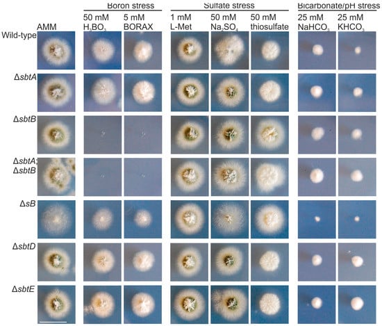 Sensitivity of sbt deletion mutants to stress. Phenotype of wild-type, ΔsbtA, ΔsbtB, (ΔsbtA;ΔsbtB), ΔsB, ΔsbtD and ΔsbtE strains after 48 h of cultivation at 37 °C in AMM and AMM with 50 mM boric acid, 5 mM Borax, 1 mM L-methionie, 50 mM sodium sulfate, 50 mM thiosulfate, or 25 mM of sodium or potassium bicarbonate. Scale bar = 2 cm.