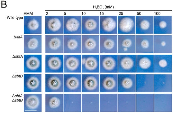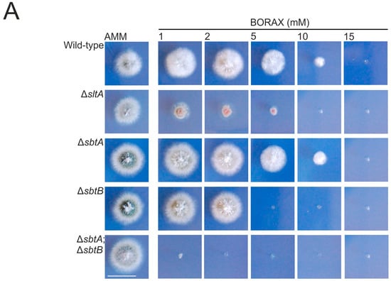 Nevertheless, considering the high amino acid sequence conservation between both SLC-family proteins, we decided to proceed with a deeper characterization of the phenotypic effect that the addition of borax (1–15 mM) or boric acid (2–100 mM) to the culture medium had on these strains (Figure 5A,B, respectively). No variation in the pH value of the culture medium was observed at the end of the culture time, suggesting that the phenotypic features that will be described were not due to alkalinization. After 48 h of cultivation at 37 °C, we confirmed that the minimum boric acid or borax concentrations required for the total inhibition of the growth of the ΔsbtB strain lay between 26–50 mM and 3–5 mM, respectively. Again, ΔsbtA showed no inhibition of radial growth compared to the wild-type. However, a role for SbtA in borate-stress response can be suggested, since the double-null ΔsbtA;ΔsbtB mutant showed severe growth inhibition compared to the ΔsbtB strain. Growth of the double-null was completely inhibited with concentrations of boric acid or borax as low as 5 mM and 1 mM, respectively (Figure 5). Overall, it seems that the role of SbtA in tolerance to borate stress is complementary to that of SbtB. Of note, in AMM amended with borax, the ΔsltA strain showed a more limited radial extension than the single ΔsbtB strain, but not more than that of the double null ΔsbtA;ΔsbtB mutant, suggesting that additional factors may control the expression or activity of these transporters.