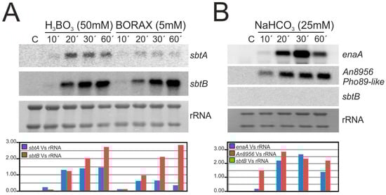 Results showed that the expression of both genes was detected ten minutes after the addition of boric acid or borax, and that in general (with the exception of sbtA in medium with borax) transcript levels increased with the time of culture under borate-stress (see quantification below the Northern-blot in Figure 6A). sbtB levels seemed to be higher than those of sbtA in almost all time-points analyzed, which correlated with the previously mentioned hypothesis that SbtB apparently has a more important role in tolerance to borates than SbtA. Transcription of sbtB was undetectable when mycelia were cultured in AMM supplemented with 25 mM sodium bicarbonate, while in the expression of controls enaA and An8956—the latter predictably coding for an inorganic phosphate transmembrane transporter similar to Pho89 of S. cerevisiae—were strongly upregulated (Figure 6B), as confirmed by RNA-seq experiments. These results support the idea that SbtB (and probably SbtA) has no role in the response to bicarbonate/pH stress.