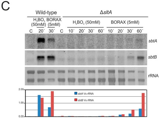 To analyze whether the transcription of sbtA and sbtB depends on the regulatory activity of SltA and on the presence of borates in the medium, Northern-blot experiments were performed (Figure 6). First, expression of sbtA or sbtB was analyzed in AMM (control) and compared to that in AMM supplemented with 50 mM boric acid or 5 mM borax (Figure 6A). Samples were collected before and after 10, 20, 30 and 60 min of the addition of these compounds.