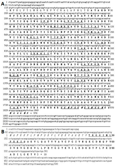 Nucleotide and deduced amino acid sequences of Cn-HSP60 and Cn-HSP10.The deduced amino acid sequence is shown upon the nucleotide sequence. The termination codon is marked by an asterisk. (A) is shown the Cn-HSP60: RGD Cell attachment sequence is shown in bold line. The conserved domain (26-571 aa, 60 kDa chaperonin (groEL) ) is in bold (Cpn60); Amidation site (193–196aa); ASN Glycosylation site (103–106 aa, 380–383aa, 426–429 aa); CAMP phosphorylation site (156–159 aa, 249–252 aa, 369–372 aa); CK2 phosphorylation site (105–108 aa, 163–166 aa, 200–203 aa, 206–209 aa, 351–354 aa, 381–384 aa, 410–413 aa, 540–543aa), Myristyl (77–82 aa, 112–117 aa, 143–148 aa, 183–188 aa, 322–327 aa, 435–440 aa, 484–489 aa, 556–561 aa, 563–568 aa, 569–574 aa); PKC phosphorylation site (70–72 aa, 200–202 aa, 231–233 aa, 247–249 aa) are underlined. The C-terminal Gly-Gly-Met (GGM) repeat is in italic. (B) is shown the Cn-HSP10: The putative mitochondrial targeting sequence is in italic. The conserved domain (GroES domain) is shaded in bold; the predicted mobile loop is underlined.