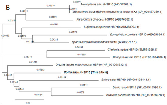 Amino acid sequences of HSP60 and HSP10 from different species were downloaded from the NCBI database for homology and phylogenetic analyses. BLAST analysis suggested that C. nasus HSP60 had higher sequence homology similarity with Clupea harengus (93%), Channa argus (89%), Danio rerio (89%), Epinephelus coioides (87%), Paralichthys olivaceus (87%), Tanichthys albonubes (86%), Megalobrama amblycephala (86%) and shared above 60% identity with other studied species’ HSP60s. HSP10 from C. nasus shared high homology with that from Danio rerio (96%), Salmo salar (96%), Ictalurus punctatus (95%), Xenopus laevis (89%), Epinephelus coioides (89%) and also shared above 60% identity with other studied species HSP10s. Phylogenetic trees were constructed by analyzing the amino acid sequences of C. nasus HSP60 and HSP10 with those from other species. Protein sequences of HSP60 and HSP10 were obtained from the NCBI data base, a neighbor-joining (NJ) phylogenetic tree indicated that the evolution of HSP60 and HSP10 was almost in accord with the evolution of species (Figure 2A,B).