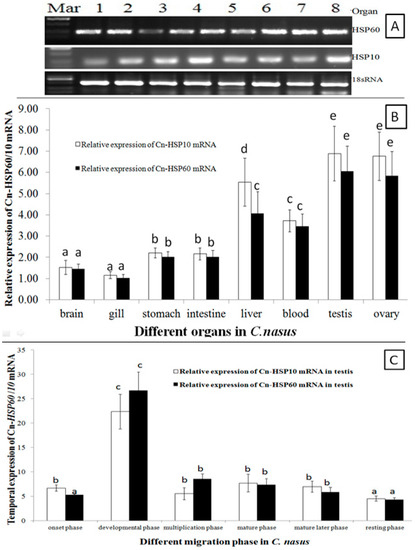 HSP60 and HSP10 mRNA transcripts were universally expressed in all examined organs (Figure 3A). Expression level was significantly higher in gonads, liver and blood; with lower levels in brain, stomach and intestine, and the lowest levels were detected in the gill (Figure 3A,B). During the migration cycle in the gonad, the HSP60 and HSP10 mRNA transcripts temporal expression patterns were in a similar way during the migration cycle (Figure 3C). Transcripts of HSP60 and HSP10 mRNA were up-regulated to peak expression in the developmental phase, and significantly lower expression was maintained during the multiplication and mature period. Then, expression was downregulated, and the lowest expression level was found in the resting phase.