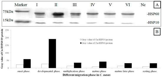 Anti-HSP60, anti-HSP10 and anti-serum are also recognized components in the crude protein extract of adult C. nasus testes. When the crude protein extracts were transferred to a nitrocellulose membrane and immunoblotted with anti-HSP60 and anti-HSP10, similar bands were observed on the immunoblot in the different phases of the migration process (Figure 4A). Control serum from the pre-immunized rabbit did not reveal recognition of any protein component in C. nasus testes extracts. The expression level of HSP60 was considerately higher than the level of HSP10. HSP60 levels were initially increasing and then declining, while HSP10 appeared declining continuously. Compared with other phases, HSP60 level reached the peak in the developmental phase. With the testes maturing, both proteins started to decline (Figure 4B).