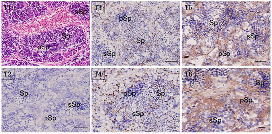 Localization of HSP60/HSP10 in the mature testis. Immunohistochemical (IHC) positive signals of HSP60/HSP10 immunolabeling are shown in brown. (T1): the whole testis section stained with H&E; (T2): negative control (NC); (T3): different part and developmental phase of testis for IHC with anti-HSP60; (T4): magnify for the IHC with anti-HSP60; (T5): different part and developmental phase of testis for IHC with anti-HSP10; (T6): magnify for the IHC with anti-HSP10, respectively. pSp: primary spermatocytes, sSp: secondary spermatocyte, and Sp: spermatids. Scale bar = 100 um.