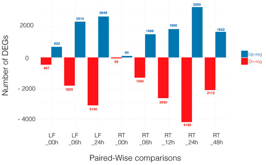 Number of differentially expressed genes (DEGs) that are upregulated (Up-reg) and downregulated (Dn-reg) in each time point comparison. LF: Leaf; RT: Root.