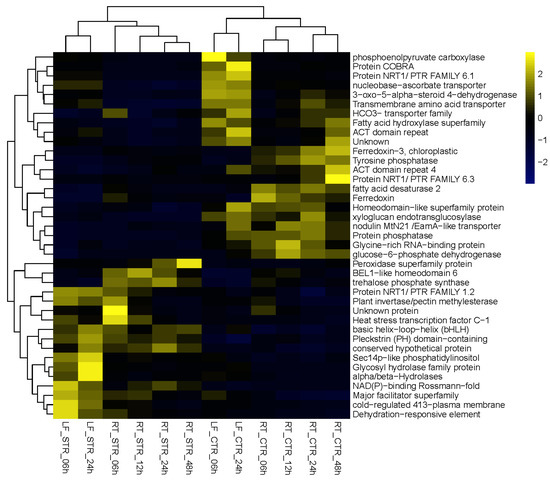 Although many of these 160 DEGs were up/down regulated based on time points and tissue, we found 17 DEGs in the dataset of 160 genes that are induced at all time points (6, 12, 24, and 48 h in roots; and 6 and 24 h in leaves) and 20 DEGs whose transcript levels were downregulated at all time points in all tissues. The expression profile of these up (17) and down (20) regulated DEGs is represented in a heatmap (Figure 3) and the top 10 most up- and downregulated from the 160 DEGs are shown in Table 2.