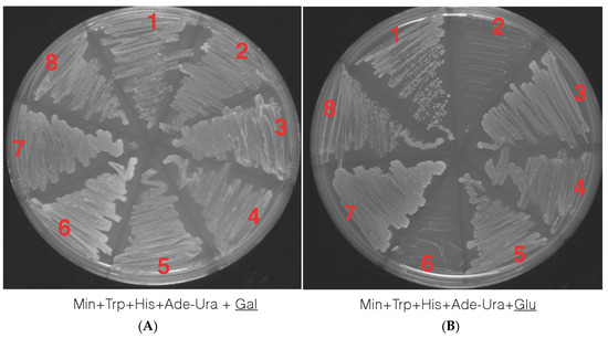 Yeast complementation studies with a carbon source of galactose (Gal, 5.A) and glucose (Glu, 5.B.) In both A and B, four different strains were transformed with empty vector (EV) or vector plus PhTPS1 gene (V + G) and streaked onto Yeast Extract Peptone Dextrose (YPD) media to assess the ⊗PhTPS1 functionality. 1. YSH290 (tps1⊗) V + G. 2. YSH290 (tps1⊗) EV. 3. YSH450 (tps2⊗) V + G. 4 YSH450 (tps2⊗) EV. 5. YSH652 double knockout (tps1⊗tps2⊗) V + G. 6. YSH652 double knockout (tps1⊗tps2⊗) EV. 7. Wild type W303-1A V + G. 8. Wild type W303-1A EV. Only YSH290 (tps1⊗) V + G and YSH652 double knockout (tps1⊗tps2⊗) V + G were able to grow in glucose when looking at the TPS1 allele showing that PhTPS1 it is capable of restoring TPS1 function in a mutant yeast. Empty vector alone failed to rescue function and YSH290 (tps1⊗) EV and YSH652 double knockout (tps1⊗tps2⊗) EV cells were not able to grow in glucose.