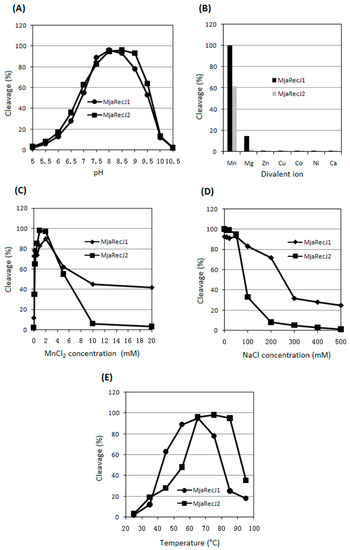 After positive detection of the nuclease activity, which is consistent with previous results [16], optimal reaction parameters with regard to pH, ion strength, divalent ions, and reaction temperature were determined for the two MjaRecJs (Figure 2). The RecJs displayed the highest activity at pH 8.0 (MjaRecJ1, Figure S1A) and 8.5 (MjaRecJ2, Figure S2A). Divalent ion manganese Mn2+ was the most effective metal cofactor (Figure S1B or Figure S2B), with the optimal concentration at 2.0 mM for MjaRecJ1 (Figure S1C) and 1.0 mM for MjaRecJ2 (Figure S2C), respectively. The two RecJs showed higher activity at lower concentrations of NaCl (Figure S1D or Figure S2D). Their optimal reaction temperatures differed. MjaRecJ1 and MjaRecJ2 showed the highest activities at 65 °C (Figure S1E) and 85 °C (Figure S2E), respectively. MjaRecJ2 is more thermostable than MjaRecJ1 (Figure S3); the result is consistent with those for the optimal reaction temperatures.