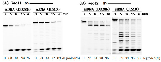 Since some nucleases hydrolyze both DNA and RNA, the (deoxy)ribose dependency of the two RecJs were characterized using ssDNA and ssRNA as substrates. MjaRecJs had a different (deoxy)ribose dependence as compared with bacterial RecJ, which only hydrolyzes ssDNA [3,14,15,20]. MjaRecJ1 could hydrolyze both ssDNA and ssRNA from the 5′ side (Figure 3A). MjaRecJ2 favored ssRNA hydrolysis with a clearly increased rate as compared with ssDNA substrate (Figure 3B). Therefore, the different (deoxy)ribose preferences of two MjaRecJs may suggest their different roles in nucleic acid metabolism in vivo.