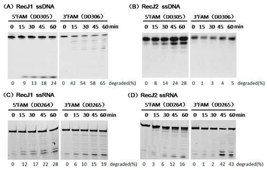 The fully phosphothioate-modified ssDNA and ssRNA were used as substrates to verify in detail the hydrolysis direction of two MjaRecJs. The existence of phosphothioate groups largely decreased the enzymatic hydrolysis rate and allowed capturing the image of each product during substrate degradation. For ssDNA degradation by MjaRecJ1 (Figure 4A), DNA ladders were generated from the 3′-FAM-labeled ssDNA, and only 1 nt products were generated from the 5′-FAM-labeled ssDNA. These results demonstrated that MjaRecJ1 degraded ssDNA from the 5′ end, and 5′-FAM group did not inhibit the hydrolysis of the first 5′ phosphodiester bond. For ssDNA degradation by MjaRecJ2 (Figure 4B), DNA ladders were generated from 5′-FAM-labeled ssDNA, and products did not appear for 3′-FAM-labeled ssDNA. These results confirmed that MjaRecJ2 degraded ssDNA in the 3′→5′ direction, and the 3′-FAM group strongly inhibited the hydrolysis of the 3′ first phosphodiester bonds. The degradation of fully-phosphothioate-modified ssDNA also showed that RecJ1 was more processive than RecJ2 (Figure 4A,B). For the fully phosphothioate-modified ssRNAs, MjaRecJ1 degraded ssRNA in the 5′→3′ direction (Figure 4C), and MjaRecJ2 degraded ssRNA in the 3′→5′ direction (Figure 4D). In summary, MjaRecJ1 was a 5′ exonuclease on both ssDNA and ssRNA, and MjaRecJ2 was a 3′ exonuclease on both ssDNA and ssRNA.