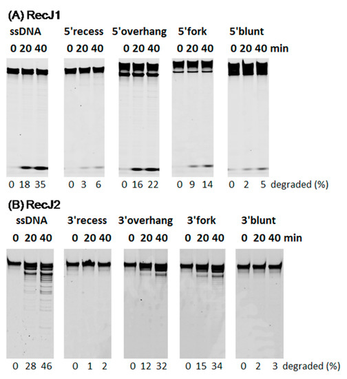 - Morimatsu, K.; Kowalczykowski, S.C. RecQ helicase and RecJ nuclease provide complementary functions to resect DNA for homologous recombination. Proc. Natl. Acad. Sci. USA 2014, 111, E5133–E5142. [Google Scholar] [CrossRef] [PubMed]