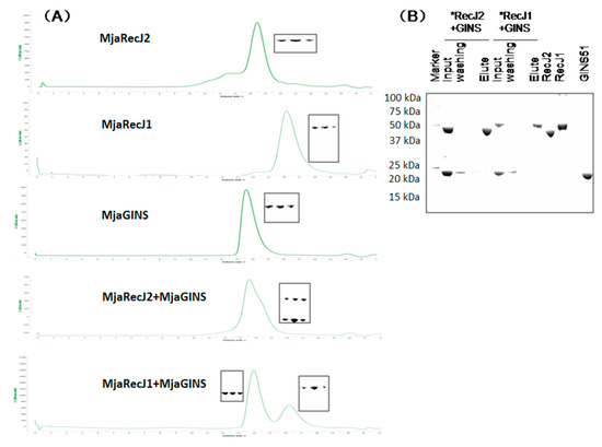 Methanocaldococcus jannaschii GINS does not interact with any of MjaRecJs. (A) Gel filtration was used to characterize the existence of complexes between MjaGINS51 and MjaRecJ1 or MjaRecJ2. Each peak was collected for protein identification by sodium dodecyl sulfate polyacrylamide gel electropheresis (SDS-PAGE). (B) The pulldown experiments were used to characterize the interaction between M. jannaschii GINS and RecJ1 or RecJ2. 6×Histine-Tag RecJs were co-purified with the no His-Tag GINS using a Ni-NTA Resin. His-Tag MjaRecJ1 or MjaRecJ2 was mixed with MjaGINS (His-Tag free) in a molecular ratio of 1:2. After binding and washing, and resins were eluted with buffer containing 200 mM imidazole. Protein(s) in elutes were verified by 15% SDS-PAGE.