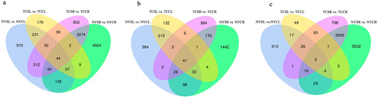 Statistics of differentially expressed genes (DEGs). (a) all of DEGs; (b) upregulated DEGs; and (c) downregulated DEGs in various NY and TC comparison groups under salt stress and control conditions.