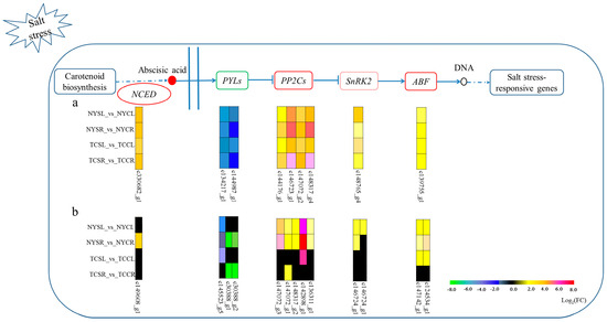 PYL-ABA-PP2C pathway in plant hormone signal transduction. (a) Expression profile of nine common DEGs across both tissues and genotypes; (b) Expression profile of twelve DEGs in NY leaves, NY roots, TC leaves, or TC roots. NYSL (NY salt-stressed leaf); NYCL (NY control leaf); NYSR (NY salt-stressed root); NYCR (NY control root); TCSL (TC salt-stressed leaf); TCCL (TC control leaf); TCSR (TC salt-stressed root); TCCR (TC control root). NCED: Nine-cis-epoxycarotenoid dioxygenase; SnRK2: SNF1-related protein kinase 2; ABF: ABA responsive element binding factor; ABA: abscisic acid; PYL: pyrabactin resistant-like/regulatory components of ABA receptors; PP2C: protein phosphatase 2C.