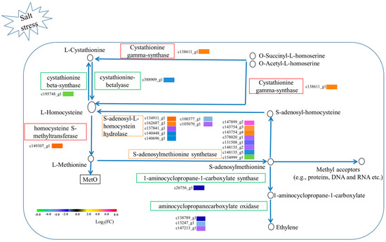The cysteine and methionine metabolism pathway was only enriched in TC root tissue. Twenty-three DEGs were involved in methionine metabolism: one cystathionine gamma-synthase (upregulated, 18.81 fold change), one cystathionine beta-lyase (downregulated, −40.36 fold change), one beta-synthase (downregulated, −92.32 fold change), one homocysteine S-methyltransferase (upregulated, 26.91 fold change), eight S-adenosylmethionine synthetase (three upregulated, 13.67~64.67 fold change; five dowregulated, −11.28~−150.33), seven S-adenosyl-l-homocysteine hydrolase (two upregulated, 15.26~29.36 fold change; five downregulated, −14.35~−60.01 fold change), one 1-aminocyclopropane-1-carboxylate synthase (part of ethylene biosynthesis; downregulated, −2.83 fold change), and three aminocyclopropanecarboxylate oxidase (part of ethylene biosynthesis; downregulated, −2.94~−73.84 fold change; DEG c147213_g1 was expressed only in TC) (Figure 6).
