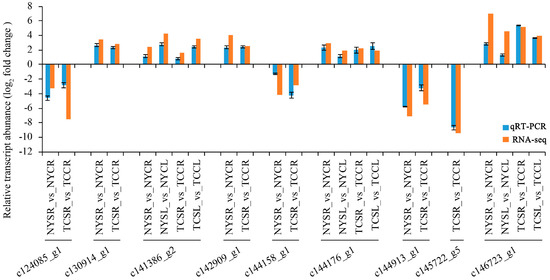 Quantitative real-time PCR (qRT-PCR) validation analysis of RNA sequencing of nine DEGs. Data represent log2(fold changes) to each DEG’s relative transcript abundance in NYSR (NY salt-stressed root) vs. NYCR (NY control root); NYSL (NY salt-stressed leaf) vs. NYCL (NY control leaf); TCSR (TC salt-stressed root) vs. TCCR (TC control root); TCSL (TC salt-stressed leaf) vs. TCCL (TC control leaf). The blue bars represent the expression via qRT-PCR and red bars represent expression via RNA-seq.