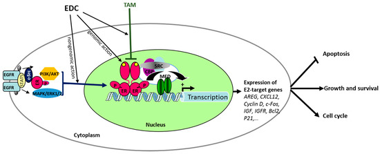 Ability of endocrine disrupter chemicals (EDCs) to alter estrogen signaling. At the cellular level, many EDCs can mimic the effects of estrogens through estrogen receptors (ERs). In the nucleus, EDCs are able to modulate transcription of E2-target genes (genomic action) by activating ER and the recruitment of cofactors such as CBP and SRC1, possessing intrinsic histone acetyltransferase activity, and the multiprotein mediators (MED) capable of modifying the chromatin organization of the specific gene promoter. In the cytoplasm, EDCs are able to interfere with pre-existing pathways (non-genomic action) altering interactions between ER and intracellular kinases (c-Src, MAPK, PI3K). EDCs like bisphenol A and diethylstilbestrol may induce rapid activation of MAPK or PI3 kinase signaling cascades, leading to ERK (extracellular-signal-regulated kinase) and AKT (Protein Kinase B) phosphorylations, intracellular calcium variations, or stimulation of cAMP production. Consequently, EDCs may influence cellular phenotypes, by genomic and non-genomic actions and responsiveness to antiestrogen tamoxifen (TAM) by changing the nuclear/cytoplasmic ER activity and expression, as well as the epigenetic and transcriptional regulations of various E2-target genes. EGFR: epidermal growth factor receptor.