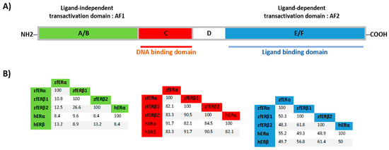 Schematic ER structure and the percentage identity between human ER (hER) and zebrafish ER (zfER) forms. (A) Different domains involved in DNA binding, ligand binding, and ligand-independent transactivation function (AF-1) and ligand-dependent transactivation function (AF-2) are indicated; (B) the percentage identity of coding regions of the N-terminal, DNA binding, and ligand binding domains between zfERα, zfERβ1, zfERβ2, hERα and hERβ, are indicated [107].