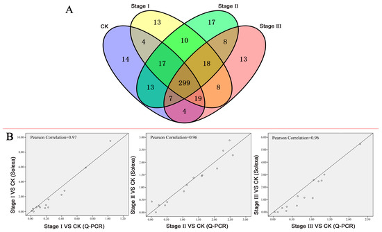 Transcription factor identification and quantitative Polymerase Chain Reaction (qPCR) validation. (A) Venn diagram showing the numbers of TFs expressed in control check (CK), stage I, stage II and stage III. Each oval indicates the numbers of transcription factors (TFs) in CK or each treatment. (B) Correlations of the expression ratios of TFs between qPCR and deep sequencing. The x-axis and y-axis represent the expression ratios of the stage sample to CK by qPCR and deep sequencing. The Pearson correlations in stage I VS CK, stage II VS CK, and stage III VS CK are 0.97, 0.96 and 0.96, respectively.