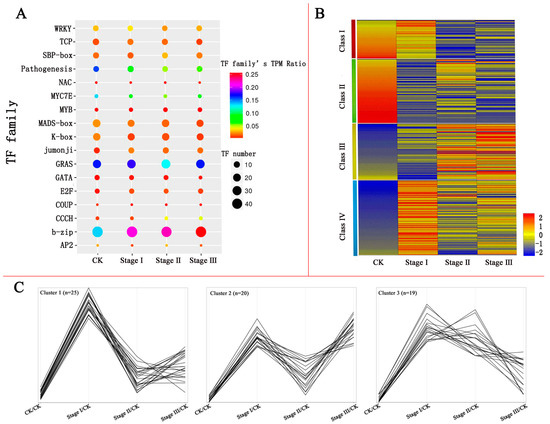 To explore significant differences in gene expression profiles between CK and stage I, stage II, and stage III, the co-modulated DETs were analysed using the K-means clustering algorithm. The 262 DETs were categorized into 4 distinct clusters (Figure 2B, Table S6). Class I contained 43 genes that were slightly changed in stage I but sharply down-regulated in stage II, with the lowest levels in stage III. A total of 72 genes in class II were sharply down-regulated in stage I, but they slightly rebounded in stage II and quickly returned to the lowest level in stage III. The expression patterns in class III genes (63 members) were the opposite of those of class II. Class IV contained 84 genes that were up-regulated in stage I, but then they rapidly decreased in stage II, and quickly rebounded in stage III. In a previous study [4], transcription factors were found to act as integrators of environmental factors to transmit and amplify adversity signals, regulating the expression of many stress-related genes, and making crops respond to adversity, eventually conferring comprehensive enhanced stress resistance. Therefore, we performed more detailed clustering for the DETs of class IV, which were responding quickly to Pb, and were up-regulated in stage I. The DETs were categorized into 3 clusters according to their expression patterns after stage I (Figure 2C). Among them, TFs in cluster 1 represented genes instantaneously responding to Pb stress, which were induced in stage I, and then returned to an expression level approximate to CK in stages II and III. TFs responding intermittently to Pb treatment were classified into cluster 2, which were up-regulated in stage I and stage III, but showed a lower expression in stage II. The genes in cluster 3 were assumed to be a class of TFs that responded continuously to Pb stress; which were up-regulated at stage I and maintained a higher level through stage III.