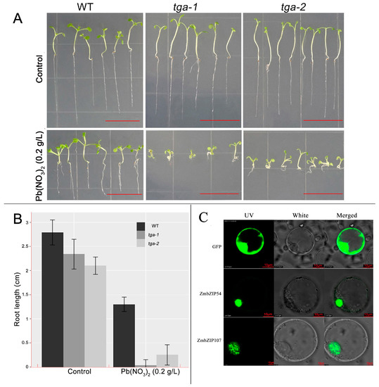 Growth of the atbzip20 and atbzip47 mutants under Pb stress and the subcellular localization of ZmbZIP54 and ZmbZIP107. (A) Plant growth of wild type and mutants on MS medium with 0 g/L Pb(NO3)2 and 0.2 g/L Pb(NO3)2. (B) Statistical analysis of root length under control and 0.2 g/L Pb(NO3)2 stress. (C) Subcellular localization of ZmbZIP54 and ZmbZIP107 proteins.
