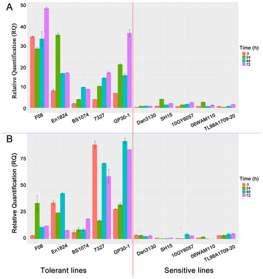 Relative expression levels of the genes ZmbZIP54 (A) and ZmbZIP107 (B) in different lines. Red, green, blue, and purple represent 0, 24, 48, and 72 h after Pb stress, respectively. The expressions of the two genes in line En1824 at 0 h were used as references. The 2−∆∆Ct method was used for calculating relative quantification (RQ).