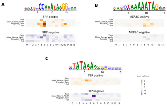 The main advantage of the new shape-restricted TF–DNA affinity model is the interpretability of the model parameters. The matrix models the adjustments of the binding energy, due to the preferred DNA shape feature at a specific TF binding position: a positive value of indicates that the higher the values of shape feature at position , the higher the TF binding affinity; but a negative value indicates that a low value of shape feature is preferred at the TF binding position. Thus, we call the (DNA) shape preference matrix. To validate the fitted shape preferences, we tested the new method on three TFs (Serum Response Factor (SRF), Myocyte Enhancer Factor 2C (MEF2C), and TATA-Box Binding Protein (TBP)) for which the DNA shape preferences were previously reported. In this test, we use PWMs from JASPAR and fit only using the ChIP-seq datasets from ENCODE. In Figure 1A, a heatmap of the shape feature preferences of SRF is shown. The most pronounced shape feature preference is for higher propeller twist at position 6, which matches the findings in [9]. The exact position may be shifted a few base pairs compared to Figure 7 in [9], because 5– and 6–mer DNA shape features are used in the previous work, while we use only dinucleotide shape features.