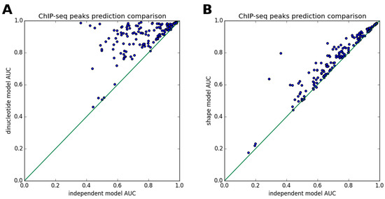 ChIP-seq peaks prediction is improved in dependency of the models. For each of the 172 ChIP-seq datasets for 36 TFs, the area under receiver operating characteristic curve (AUC) of the independent model is compared to (A) the full dinucleotide model, which has a separate tunable parameter for each of 16 possible dinucleotides at each position; and (B) the DNA shape-restricted dinucleotide model, which has a separate tunable parameter for each shape feature (e.g., four DNA shape features in the current study) at each position.