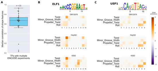 Shape model parameters in different conditions. (A) Distribution of median correlation coefficients for 23 TFs with multiple ChIP-seq datasets; (B) Shape feature preferences for ELF1 in three cell lines. The heatmaps show the preference for each shape feature at each position (the inferred matrix). Only the positive preferences are shown, that is, the preferences towards higher values of shape features. Colors faded to grey mean weaker preference; (C) Shape feature preferences for USF1 in three cell lines. The PWM logos are shown above the predicted shape preference heatmaps.
