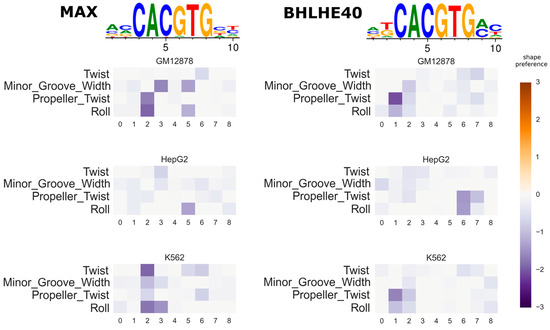 Predicted shape preferences of MYC Associated Factor X (MAX) and Basic Helix-Loop-Helix Family Member E40 (BHLHE40) in three cell lines. The heatmaps show the preference for each shape feature at each position (the inferred matrix). Only the negative preferences are shown here, that is the preferences towards lower values of shape features. Colors faded to grey mean weaker preference. The PWM logos are shown above the shape preference heatmaps.