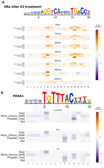 Changing cellular conditions may result in changing gene expression, which is caused by fine-tuning of TF–DNA interaction patterns. This adjustment is tightly controlled and thus may be reflected in the DNA shape feature preferences of affected TFs. Our new model allows identifying such changes by inferring shape preferences from ChIP-Seq data with different conditions. Here, we test the new model on the estradiol (E2)-treated MCF7 breast cancer cell line. It has been observed that the response of treatment includes chromatin reorganization [37], which prompts the investigation of possible DNA shape preference changes in the TFs involved. We used two public ChIP-seq datasets (GEO GSE94023 and GSE72249 [28]) to study this system. In Figure 5A (and Supplementary Figure S3A for negative preferences), the evolution of shape preferences of estrogen receptor α (ERα/ESR1) is shown at different time points after the treatment of MCF7 cells with E2. After E2 stimulation, ERα enters the nucleus and binds to specific sequences in the DNA called estrogen response elements. The shape preferences of ERα remain relatively stable across time. After 320 min, the shape preference becomes weak, likely due to reduced signal as there are much fewer strong peaks.