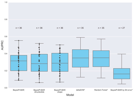 We first tested the accuracy of baseline PWM models. BayesPI-BAR uses several alternative PWMs for the same TF simultaneously, in which case the predicted scores for each PWM are averaged. We used several sets of PWMs in this test: (1) 26 PWMs from the JASPAR database, one for every TF is available; (2) 129 PWMs for 28 TFs from the database of 1772 PWMs that was used in the original BayesPI-BAR publication; (3) 112 PWMs for 33 TFs inferred by the BayesPI2 motif discovery program based on ChIP-seq datasets with motif sizes of 10, 15 and 20. The results of these tests are shown in Figure 6. We use the area under the precision-recall curve (AUPRC) as the measure of prediction performance due to class imbalance in the ASB dataset. The median AUPRC of BayesPI-BAR is ≈0.32, which is comparable to the accuracy of other machine learning approaches in [29] (e.g., ≈0.35). However, it is significantly higher than a previous report in [29], where it was ≈0.15. Such a performance discrepancy of BayesPI-BAR in the same datasets may be caused by misusing of principal component analysis (PCA) scores in the earlier work [29], instead of using the mean scores in the current work.