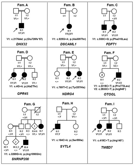 Pedigrees of families (Fam) harboring inherited retinal diseases (IRD) candidate gene variants inherited in an autosomal recessive manner. Double lines denote consanguinity, open squares and circles represent healthy males and females respectively, black squares and circles represent affected males and females respectively, diagonal line indicates deceased person, arrows point to the probands, Roman numbers denote the generation number, Greek numbers address the individual in each generation, V1 and V2 depicts the variants in the families, Y denotes Y-chromosome, ‘+’ indicates a wild type allele, (;) indicates that segregation analysis was not performed. DHX32: DEAH-Box Helicase 32; DSCAML1: DS Cell Adhesion Molecule Like 1; FDFT1: Farnesyl-Diphosphate Farnesyltransferase 1; GPR45: G Protein-Coupled Receptor 45; NDRG4: NDRG Family Member 4; OTOGL: Otogelin Like; SNRNP200: Small Nuclear Ribonucleoprotein U5 Subunit 200; SYTL4: Synaptotagmin Like 4; TMED7: Transmembrane P24 Trafficking Protein 7.