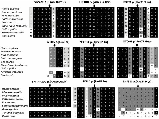 Amino acid conservation for the missense variants identified in this study. DSCAML1: DS Cell Adhesion Molecule Like 1; EP300: E1A Binding Protein P300; FDFT1: Farnesyl-Diphosphate Farnesyltransferase 1; GPR45: G Protein-Coupled Receptor 45; NDRG4: NDRG Family Member 4; OTOGL: Otogelin Like; SNRNP200: Small Nuclear Ribonucleoprotein U5 Subunit 200; SYTL4: Synaptotagmin Like 4; ZNF513: Zinc Finger Protein 513.