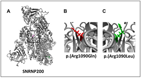 3D protein structure modeling for missense variants in SNRNP200 due to autosomal dominant and recessive variants. (A) An overview of the 3D protein structure model for SNRNP200. Arg1090 is located in the center of the model indicated by the square. (B) Modeling of the missense variant identified in family G. The autosomal recessive variant alters to glutamine that is uncharged but has the same polarity as the wild type amino acid. (C) The previously described SNRNP200 variant p.(Arg1090Gln) leads to a dominantly inherited retinitis pigmentosa (RP). The wild type arginine is altered to a nonpolar and hydrophobic leucine.