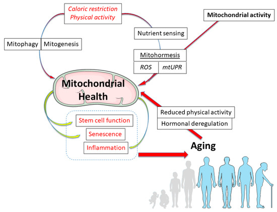 Many evolutionary and mechanistic theories have been elaborated on, trying to explain why and how living organisms age. For instance, the “somatic mutation” theory suggests that aging is due to the increase other time in DNA damage and somatic mutation, while the “telomere loss” theory postulates a decline in cellular division capacity with age, linked to the progressive shortening of telomeres in somatic tissues. The “altered proteins and waste accumulation” theory rather advocates an accumulation over time of damaged proteins, protein turnover being essential to preserve cell function and the accumulation of altered proteins contributing to a range of age related disorders [1,2]. However, from a mechanistic point of view, among all the theories, those that see mitochondria as main actors occupy a particular place. Indeed, mitochondria have been at the center of one leading hypothesis for 50 years: the free radical theory [3]. Even though the scientific community has shifted to a more complex view to explain aging, embracing a network of events, mitochondria remain of high importance because of their central position in cell homeostasis of almost every tissue. Thus, as far as the description of molecular and cellular mechanisms are concerned, mitochondria have been shown to participate in every main aspect of aging: decline of stem cell functions, cellular senescence, “inflammaging” and many others [4,5] (Figure 1). The role of mitochondria in metabolic pathways is also particularly important. Their modulation, such as with caloric restriction and aerobic exercise, in turn, represents interventions than can increase lifespan [6,7] (Figure 1). Before any mechanistic consideration, however, the involvement of mitochondria in aging has been historically supported by several reports describing decreased mitochondrial functions in aged tissue [8].