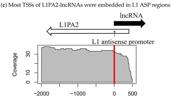 We investigated a general trend in the location of L1PA2 elements relative to lncRNA TSSs. Notably, most of the antisense L1PA2 elements were located at nearly the same site relative to lncRNA TSSs. These L1PA2 elements overlapped with lncRNAs by about 500 nt (Figure 3a,c). In other words, most TSSs of L1PA2-lncRNAs were embedded in L1 ASP regions, which are located in the L1 5’-UTR (positions 400–600) []. Furthermore, as we expected, this trend was not observed in L1PA2 elements in a sense orientation relative to lncRNAs (Figure 3b). Thus, these findings support the hypothesis that the ASP region of L1PA2 functions as a promoter of lncRNAs. Indeed, transcripts derived from L1 ASP were comprehensively identified by Criscione et al. 2016 []. However, among the 33 lncRNAs detected in this study (Supplementary Table S2), 23 out of the 33 lncRNAs were newly identified by the present analyses.