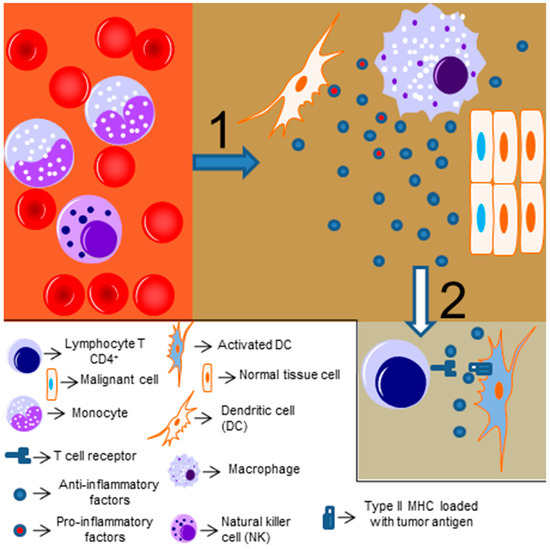 The link between inflammation and cancer was realized over 150 years ago, when Virchow described that the presence of immune cells could be related to the place where the cancer would appear in an inflamed tissue [58,59,60,61,62]. Chronic inflammation (driven by infectious or non-infections insults) is associated with cancer development [63]. The exact mechanism linking inflammation and tumorigenesis is not fully understood, but it is known that reactive oxygen species and other potentially harmful mediators of the immune response might induce genetic instability and promote mutations in tissues cells [64,65]. Moreover, chronic and persistent low-level degrees of inflammation might be accompanied by infiltrating anti-inflammatory and regulatory immune cells, which will attempt to resolve the inflammatory response and induce cell proliferation and angiogenesis (as a tissue repair mechanism), thus protecting the tumor from other immune cells and providing a signal to maintain its proliferative and invasive profile [64]. This idea was reinforced by Dvorak [66], who stated that “cancers are wounds that do not heal” (Figure 2 represents a simplified scheme of the tumor immune response). Thus, depending on the level and type of inflammatory response, it can present an antitumor effect or even stimulate and promote tumor growth and invasion.