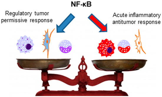The importance of NF-κB for antitumor immunity mediated by other immune cells, such as NK cells, NKT cells, γδ T cells, and T CD8+ cells, has not yet been analyzed, and studies with this aim would be interesting, as all of these cells have been previously described to present antitumor activities [142,185,186,187,188,189]. Interestingly, anergic T CD8+ cells, which are present in different cancers and are usually associated with impaired antitumor immunity [190], have ablated NF-κB activation [140]. Thus, the restoration of NF-κB activation in these cells could be a possible mechanism to circumvent the anergic phenotype and induce antitumor immunity. However, as previously discussed, NF-κB plays also an important role in Tregs and myeloid-derived suppressor cell functions; thus, the context, the type of infiltrating immune cells in the tumor, and the milieu are crucial for the role of NF-κB in the antitumor immunity (as simplified in Figure 3).