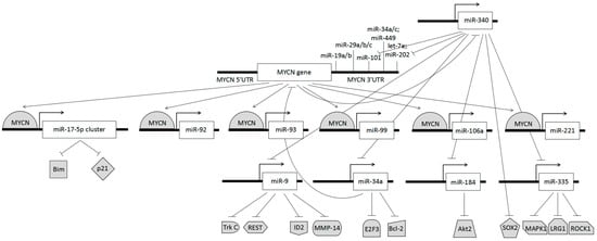 As shown in previous studies, expression levels of the MYCN gene are closely interlinked with an abnormality in miRNA regulation patterns [163,164,165,166] (Figure 1). In the presence of MYCN amplification several miRNAs, including miR-17-5p, miR-92, miR-93, miR-99, miR-106a, and miR-221, are upregulated. Malignant NB growth in the presence of MYCN amplification is correlated to the transactivation of the miR-17-5p-92 cluster [167,168,169]. This cluster inhibits translation of the cell cycle negative regulator cyclin-dependent kinase inhibitor 1 (p21) and Bcl-2-like protein 11 (Bim), a Bcl-2 interacting mediator of cell death [170]. By targeting this miRNA cluster using antago-miR-17-5p, p21, and Bim can be de-regulated, therefore inhibiting cell cycle processes and favouring apoptosis respectively, ultimately developing a treatment for counter growth of therapy-resistant malignant NB [170].