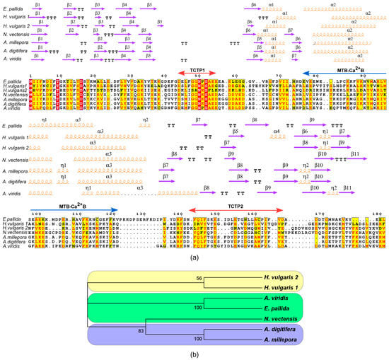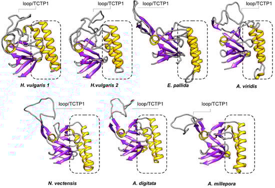 Analyses of 3D structures showed that cnidarian TCTPs grossly consist of a β-stranded ‘core’ domain usually comprising four beta-sheets and three α helices. H2 and H3 α helices form an alpha-helical hairpin and allocate both the tubulin-binding region and the Ca2+-binding motif [53]. A flexible loop located between the core and the helical domain represents a key feature for TCTP proteins, thus revealing a canonical TCTP1 signature.