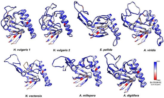 It is known that exposure to the solvent is negatively correlated with conservation [54,55,56,57,58]. Therefore, these solvent-exposed sites may likely provide tolerances to amino acid substitutions, which in turn allowed variability to accumulate without functional alteration in protein structures. To probe such assumption, conservation analysis among members from the TCTP family was also carried out and TCTPs from different organisms with experimentally determined 3D structures were collected and aligned with cnidarian homologues (see alignments collected in Supplementary Materials).