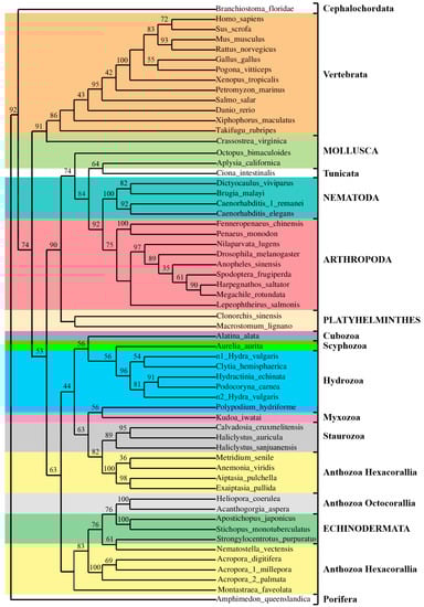 - Putnam, N.H.; Srivastava, M.; Hellsten, U.; Dirks, B.; Chapman, J.; Salamov, A.; Terry, A.; Shapiro, H.; Lindquist, E.; Kapitonov, V.V.; et al. Sea anemone genome reveals ancestral eumetazoan gene repertoire and genomic organization. Science 2007, 317, 86–94. [Google Scholar] [CrossRef] [PubMed]