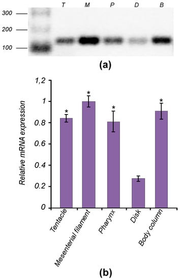 It has been reported that TCTP homologues, including those from mammals [1], fishes [62,63], molluscs [10,11] and decapods [5,7] are expressed in a variety of cell types and tissues. To evaluate the tissue-specific expression pattern of TCTP also in the basal anthozoan, total RNA was isolated from tentacles, body column, pharynx, mesenterial filaments and basal disk of A. viridis and RT-PCR analysis were performed (Figure 7). The AvTCTP transcripts were detected in all tissues herein analysed signifying that AvTCTP was ubiquitously distributed and constitutively expressed in sea anemone under normal physiological conditions.