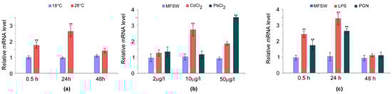 Expression profiles of AvTCTP in response to physical and biotic challenges. (a) Sea anemones were challenged by hyperthermic conditions at 28 °C, while animals maintained at 18 °C were used as controls. The tentacles were sampled at different time points post-challenge (0.5 h, 24 h and 48 h). (b) Sea anemones were exposed to Pb and Cd at different concentrations for 12 h, while animals maintained in MFSW were used as controls. (c) Sea anemones were stimulated with different immunogens, while HBSS injected animals were used as controls. Portions of basal disk were sampled from different animals at different time post-challenge (0.5 h, 24 h and 48 h). The expression level of AvTCTP was analysed by qRT-PCR with RCC2 and COP-γ as references. The results are represented as means ± standard deviation (SD) (n = 3). Statistical analysis by one-way ANOVA with Tukey’s post-test. ** correspond to p < 0.005.