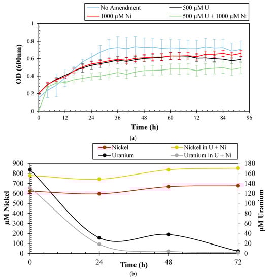 The ability of bacterial strains to resist U toxicity has been previously demonstrated. In fact, 90% of bacteria representative of taxa Firmicutes, Gammaproteobacteria, Actinobacteria, Bacteroidetes, and Betaproteobacteria identified from the Uranium mining site of Domiastat, India, were found to be resistant to a high U concentration of 4 mM [21]. Kulkarni et al. [22] isolated two phosphatase producing bacteria- Escherichia coli and Deinococcus radiodurans, which were found to grow in as high as 20 mM U. Burkholderia fungorum isolated from Rifle, Colorado, was found to grow on 10 µM U [23]. Similarly, several strains resistant to particularly high concentrations of Ni have been isolated from various contaminated sources. Alboghobeish et al. [24] isolated several strains, namely Methylobacterium sp. ATHA7 and Klebsiella oxytoca ATHA6 resistant to 24 mM and 16 mM Ni, respectively, from industrial sewage. Cupriavidus taiwanensis isolated from the root nodules of Mimosa pudica was found to be resistant to 1.5 mM Ni, along with some other heavy metals [25]. To determine the resistance potential of strain SRS-1-W-2016 against U and Ni, different concentrations of these metals were supplemented in 4M media and the growth results are presented in Figure 1a. Strain SRS-1-W-2016 could resist up to 4.2 mM of U and 8.5 mM of Ni, which are the typical concentrations of these metals in the sampling location [13], albeit, rapid growth was only observed at much lower concentrations of 500 µM U and 1000 µM Ni, respectively; a stationary phase was reached in 48 h. A similar trend was shown in the presence of 1000 µM Ni. When grown in the combination of 1000 µM Ni and 500 µM U, the stationary phase was only achieved after 60 h of incubation, potentially due to the combined stress of both U and Ni. In the native soil environment from where the strain was isolated, both U and Ni are the major co-contaminants and therefore the growth profile obtained for these co-contaminants provides a more accurate representation of the strain’s metal resistance ability.
