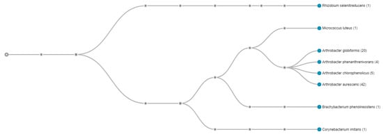 Whole genome sequence-based phylotree of Arthrobacter sp. strain SRS-W-2-2016 relative to a cohort of 24 Arthrobacter spp., for which genome sequences are available. The highest taxonomic affiliation of strain was found with Arthrobacter aurescens TC1 based on the highest number of whole genome sequence reads (42; shown in parenthesis) that clustered with this group. The tree was generated based on the presence of the Pfam function category amongst Arthrobacter spp. available in the integrated microbial genome expert review (IMG/er) database. Displayed nodes are those with at least one read (<1% of classified reads).